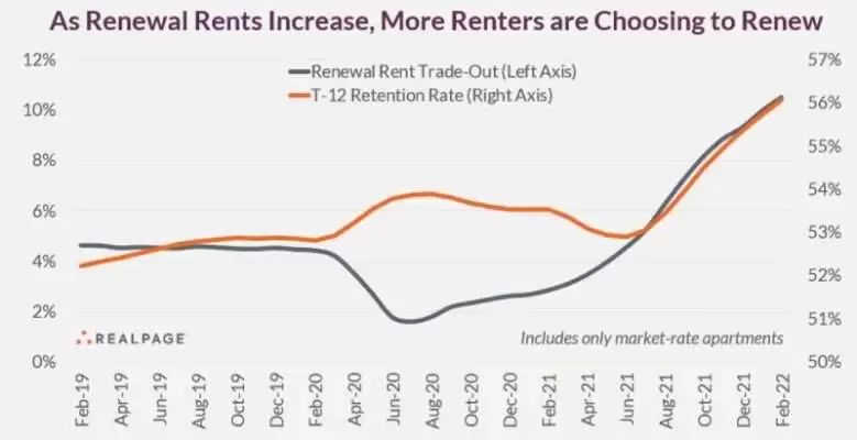 Rents for market-rate apartment households renewing their lease increased 10.5% in February 2022. At the same time, renters with expiring leases renewed their leases at the highest T-12 rate on record at 56.1%.