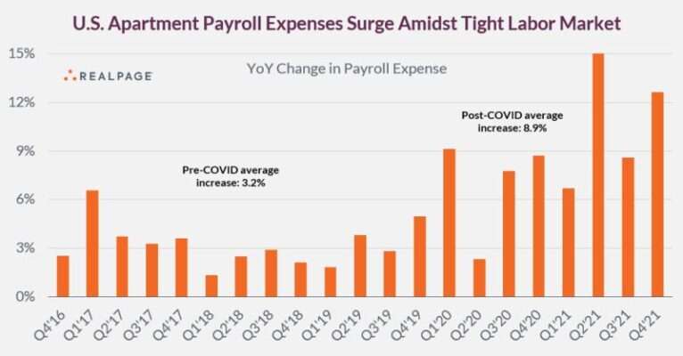 Apartment operators are fighting to retain and hire talent, and that’s a win for community managers, leasing agents and maintenance technicians. Apartment payrolls have surged by 12.6% in 2021 — lifting the average increase in the COVID-era to 8.9%. By comparison, payrolls grew by an average of 3.2% annually pre-COVID.