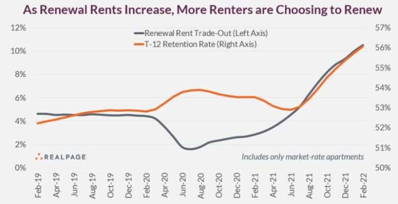 As renewal rents increase, so does retention. Basic economics teaches us that renewal demand will drop once price becomes an obstacle. But that isn’t happening yet.