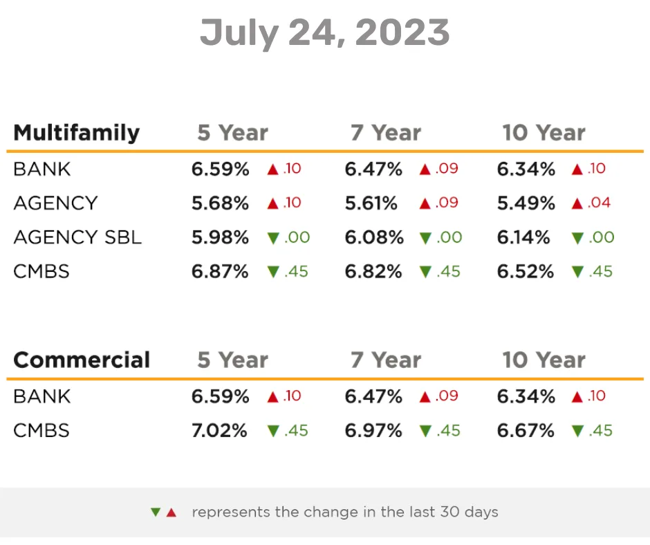 Average of the top competitive rates from eXp Commercial’s National Capital Markets Partner CommLoan from a database of 700+ commercial lenders as of 7/24/23