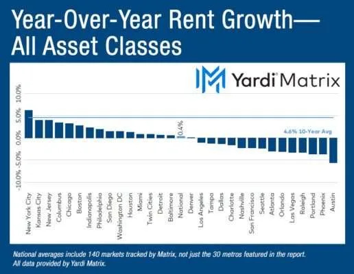 Year-over-year multifamily rent growth, all asset classes. Chart courtesy of Yardi Matrix