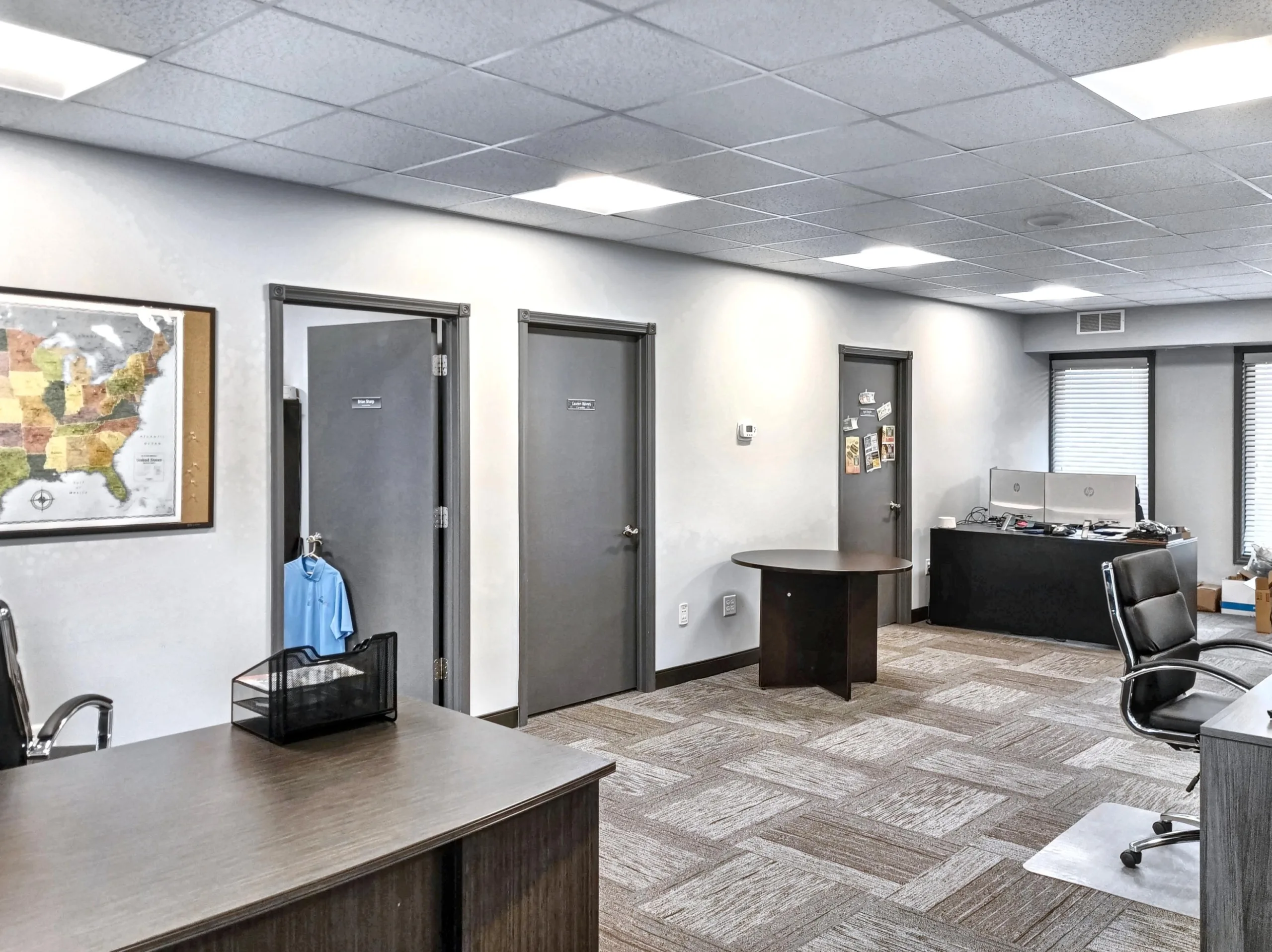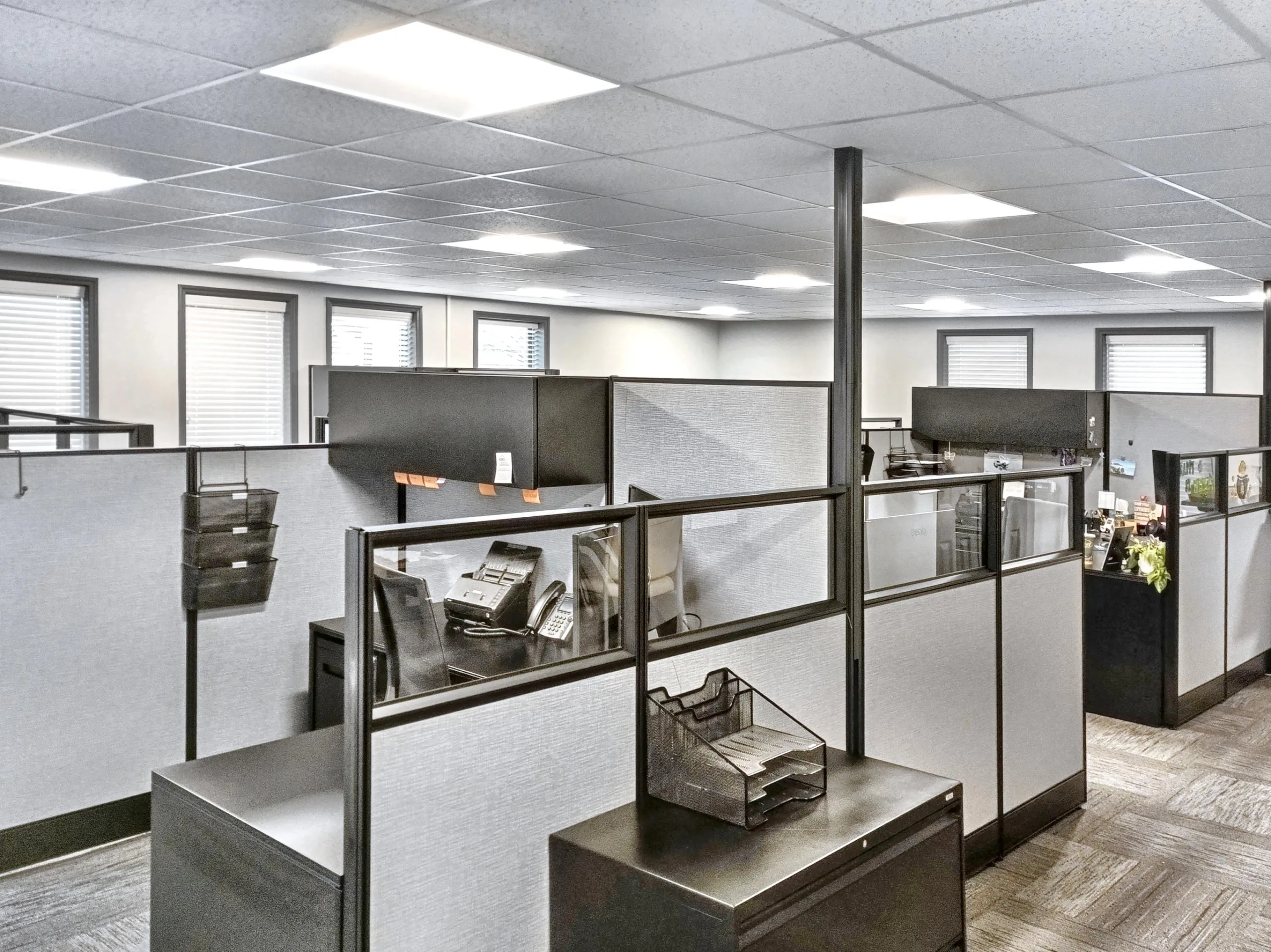 - Functional layout: reception, private offices, conference rooms, open workstations